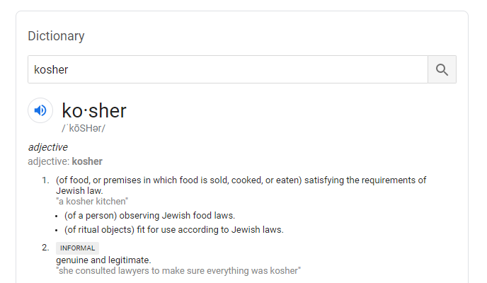 Kosher in popular culture has come to be more than a word simply referring to Hebrew practices. It has come to be a word describing "when guidelines are kept and protocols are enforced".